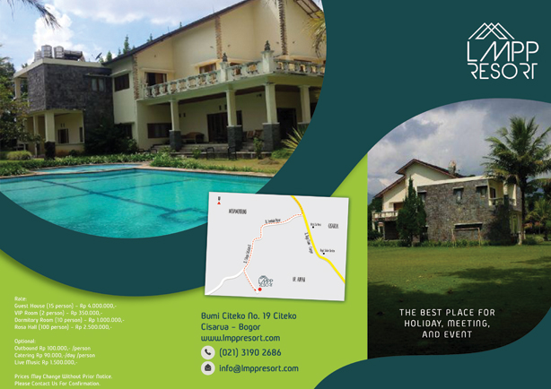 LMPP RESORT adalah Villa dan Hall yang terletak di Bumi Citeko ,Cisarua –Bogor, dibangun diatas lahan hijau seluas 3 ha dengan udara yang sejuk. Baik untuk acara rekreasi perusahaan, keluarga, maupun untuk tempat penyelenggaraan kebutuhan rapat atau training , LMPP RESORT adalah tempat tujuan yang tepat untuk anda.